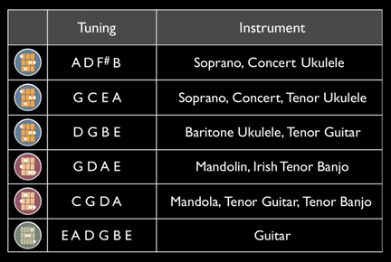 | Soprano Uke | Ukulele | Baritone Uke | Guitar | Mandolin | Tenor Banjo |