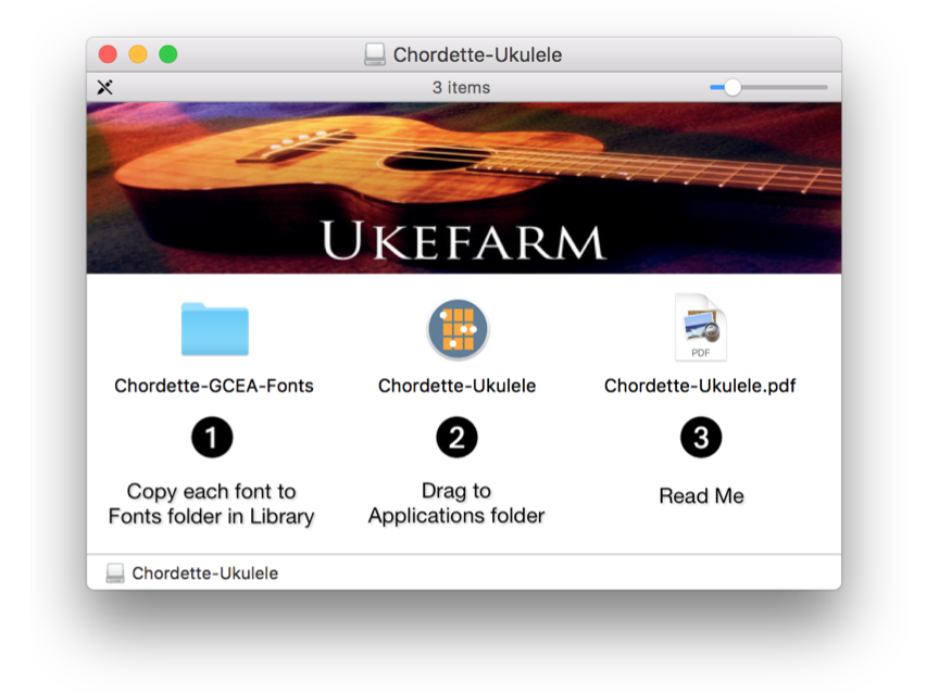 Double click the dmg file. Chordette for requires eight custom chord fonts, which are included with the application. It is important to install the fonts before opening the Chordette app, or else you will just see alphanumeric characters displayed rather than the chords. On your main drive, open the Library folder, and then open the fonts folder. Copy and Paste the fonts into the Fonts folder. It is recommended that you retain the dmg file as a backup.