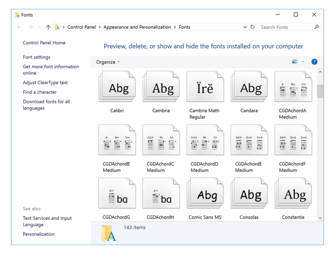 The next step is to install the custom fonts. Chordette requires eight custom chord fonts, which are included with the application. It is important to install the fonts before opening the Chordette app, or else you will just see alphanumeric characters displayed rather than the chords. Open the Chordette-[Tuning]-Fonts folder. In Windows 10, access the font control panel. Click in Windows 10's Search field (located just to the right of the Start button), type "fonts," then click the item that appears at the top of the results: Fonts - Control panel. Drag each custom chord font to the main window. When you drop the font, you'll see a brief "installing font" message. If you are using an older Windows version and need help, google font installation for your operating system version.