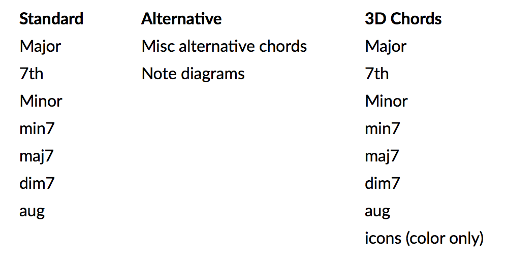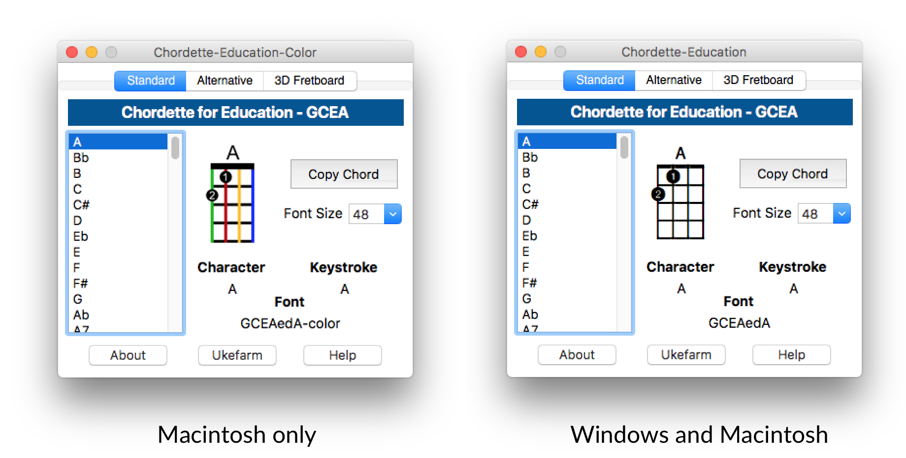 Chordette for Education is a ukulele chord library program created specifically for schools and individual instructors. It can be used for creating song sheets, presentations, or adding chords to videos. This education version has a basic chord set for beginners, featuring finger numbering, alternate chords, and 3D chords. It also is available in color for Macintosh to support Aquila Kids strings. When used with a word processing program, chord charts can be built by using the keystroke information for entering the chords, or using the Copy button to paste chords into the document.