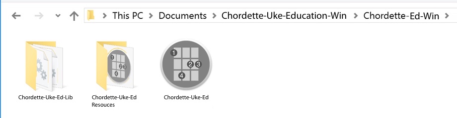 The Chordette-Ed-Win folder contains the Chordette-Uke-Education app and two additional folders. This folder can be located where you choose. It does not need to be in your Applications folder, but you must keep the Chordette-Uke-Education app inside the Chordette-Ed-Win folder with the other two folders.