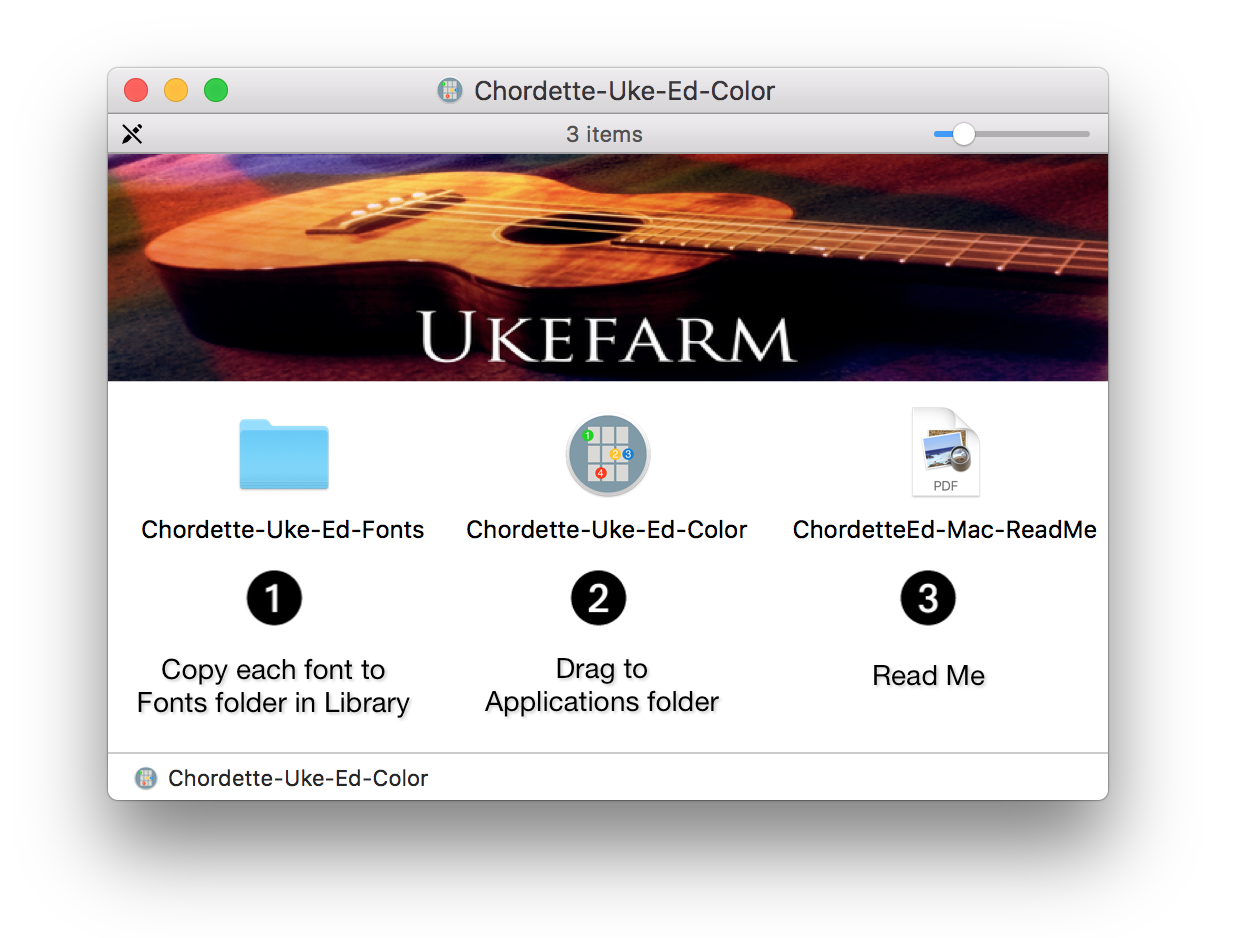 Chordette for Education for macOS is distributed as a dmg file named Chordette-Uke-Education-Mac (Chordette-Uke-Ed-Color-Mac for the color version). The dmg file contains the following components:Double click the dmg file. Chordette for Education for requires three custom chord fonts, which are included with the application. It is important to install the fonts before opening the Chordette for Education app, or else you will just see alphanumeric characters displayed rather than the chords. On your main drive, open the Library folder, and then open the fonts folder. Copy and Paste the fonts into the Fonts folder. It is recommended that you retain the dmg file as a backup.