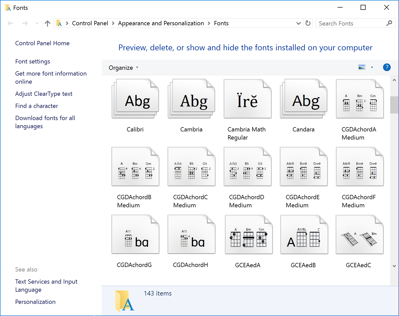 The next step is to install the custom fonts. Chordette requires three custom chord fonts, which are included with the application. It is important to install the fonts before opening the Chordette for Education app, or else you will just see alphanumeric characters displayed rather than the chords. Open the Chordette- Uke-Ed-Fonts folder. In Windows 10, access the font control panel. Click in Windows 10's Search field (located just to the right of the Start button), type "fonts," then click the item that appears at the top of the results: Fonts - Control panel. Drag each custom chord font to the main window. When you drop the font, you'll see a brief "installing font" message. If you are using an older Windows version and need help, google font installation for your operating system version.