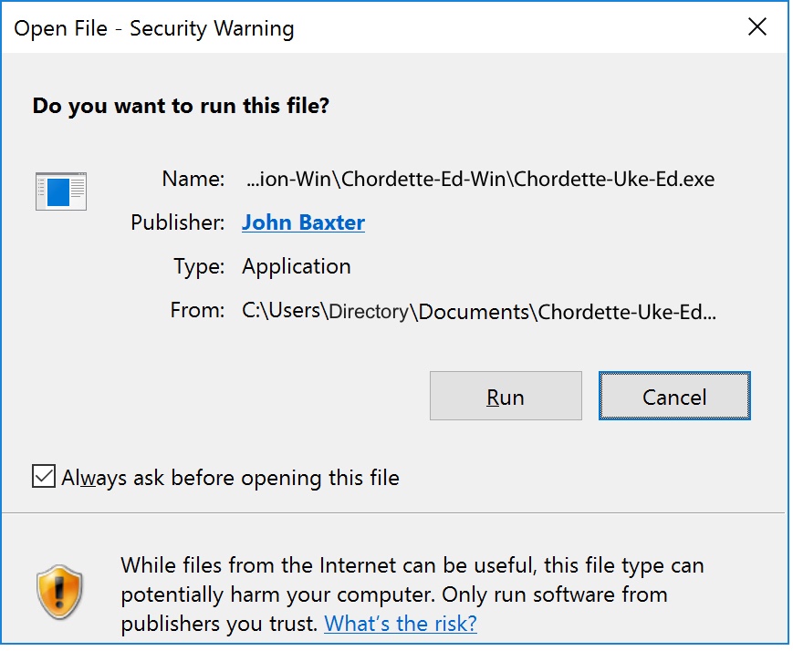 The first time you run the app you will get a run file dialog. Chordette for Education has been code signed to ensure that the app has not been tampered with. Any modifications to the app will invalidate the code signature and alert you that the publisher is unknown. It is recommended that you retain the zip file as a backup.