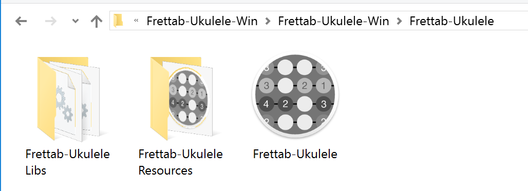 The Frettab-Uke-Win folder contains the Frettab-Ukulele app and two additional folders. This folder can be located where you choose. It does not need to be in your Applications folder, but you must keep the Frettab-Ukulele app inside the Frettab-Uke-Win folder with the other two folders.