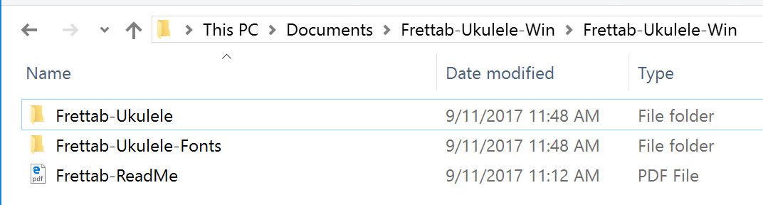 The zip file will be extracted to the destination you chose. There will be a folder named Frettab-Uke-Win. Open the folder to view the contents.