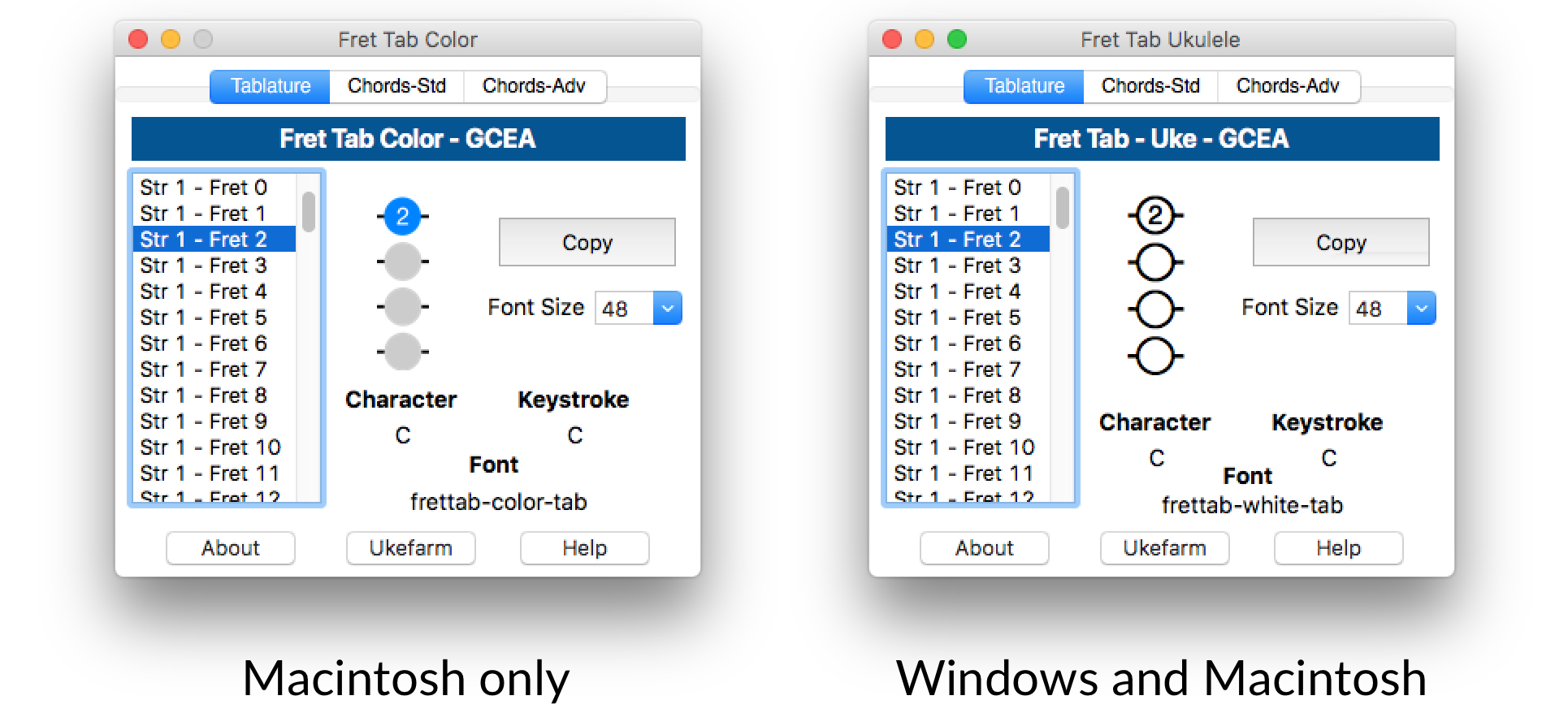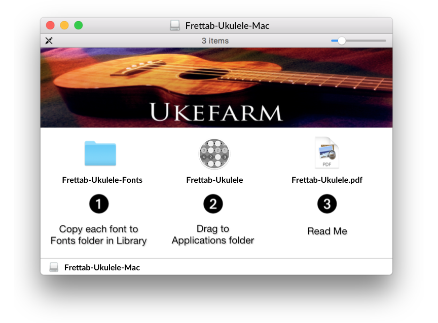 Fret Tab for macOS is distributed as a dmg file named Frettab-Uke-Color-Mac for the color version, and Frettab-Ukulele-Mac for the black and white version. The dmg file contains the following components: