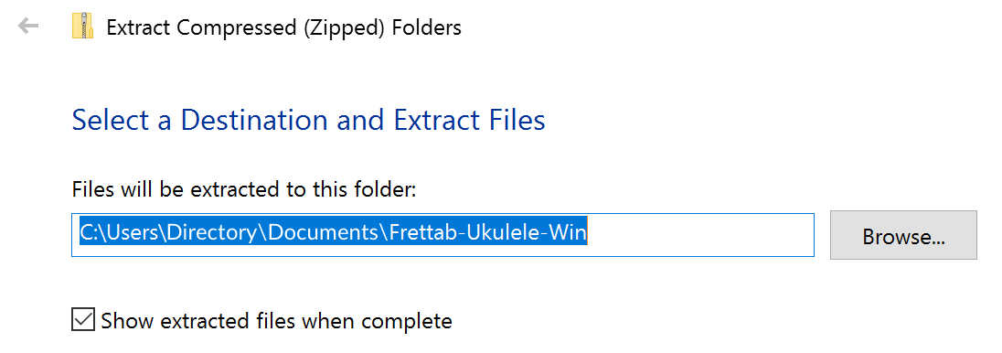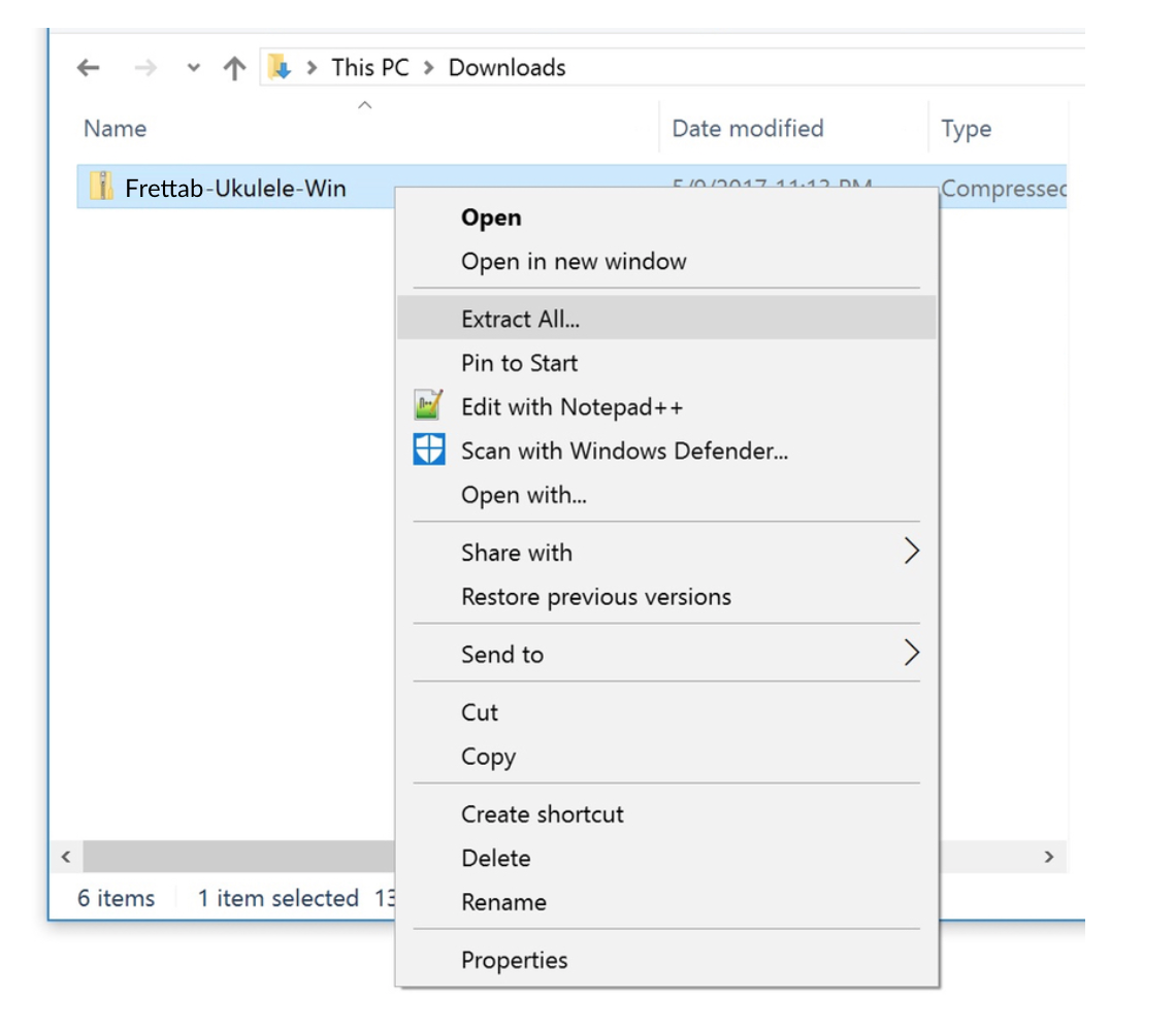 Fret Tab for Windows is distributed as a zip file named Frettab-Ukulele-Win. After you download the zip file, right-click on the file and select Extract All...