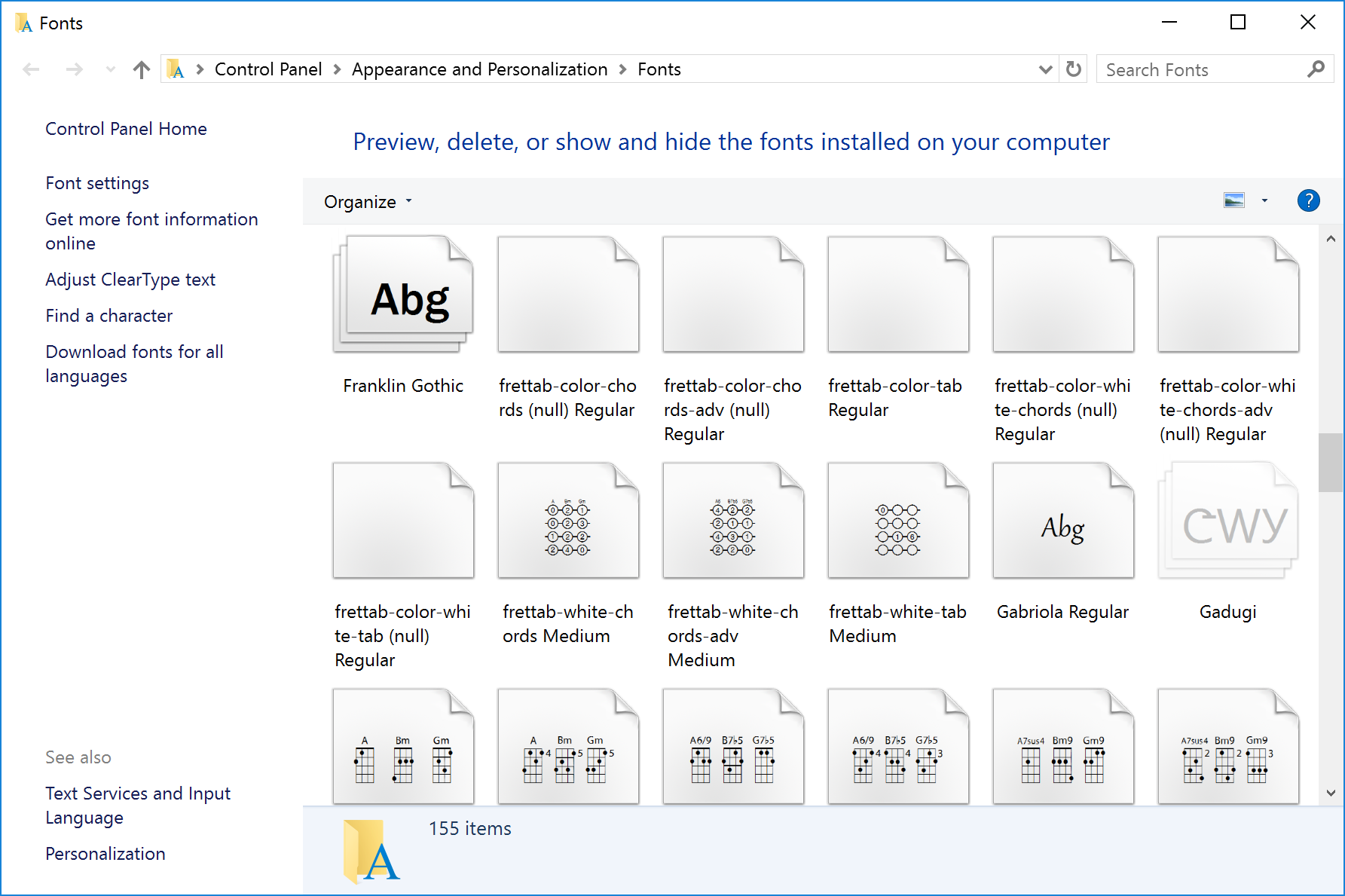 The next step is to install the custom fonts. Fret Tab requires three custom fonts, which are included with the application. It is important to install the fonts before opening the Fret Tab app, or else you will just see alphanumeric characters displayed rather than the chords. Open the Frettab-Uke-Fonts folder. In Windows 10, access the font control panel. Click in Windows 10's Search field (located just to the right of the Start button), type "fonts," then click the item that appears at the top of the results: Fonts - Control panel. Drag each custom chord font to the main window. When you drop the font, you'll see a brief "installing font" message. If you are using an older Windows version and need help, google font installation for your operating system version.