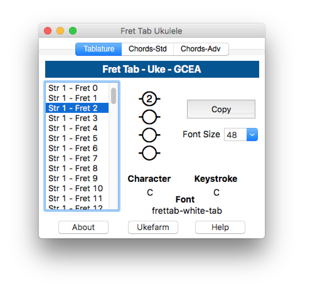 Fret Tab is a simplified redesign of the basic tablature format, using a layout consisting of a sequence of notes overlaid on a fretboard-like structure. It is intended for those that want a quick way to capture a basic melody, for teachers and individual instructors, and for those that may be intimidated by more complex Tablature features. Fret Tab is also available in color for Macintosh to support Aquila Kids strings.