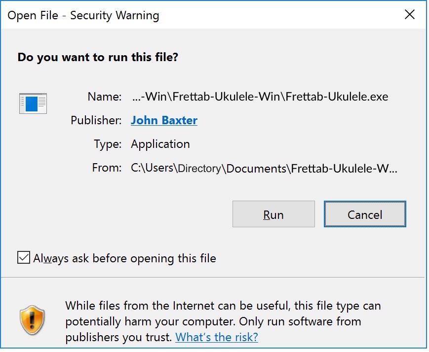 The first time you run the app you will get a run file dialog. Fret Tab has been code signed to ensure that the app has not been tampered with. Any modifications to the app will invalidate the code signature and alert you that the publisher is unknown. It is recommended that you retain the zip file as a backup.