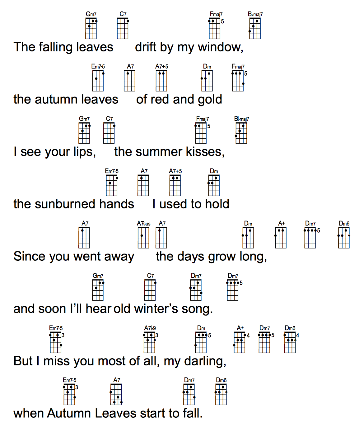 | Autumn Leaves was originally a 1945 French song titled, "Les Feuilles Mortes" (literally "The Dead Leaves"), with music by Hungarian-French composer Joseph Kosma and lyrics by poet Jacques Prévert. In 1949 American songwriter Johnny Mercer wrote English lyrics for the tune changing the original French title to "Autumn Leaves". The song is in AABC form. "Autumn Leaves" offers a popular way for beginning jazz musicians to become acquainted with jazz harmony as the chord progression consists almost solely of ii-V-I and ii-V sequences which are typical of jazz. It was originally, and is most commonly, performed in the key of G minor, but is also played in E minor and other keys. -- Wikipedia |