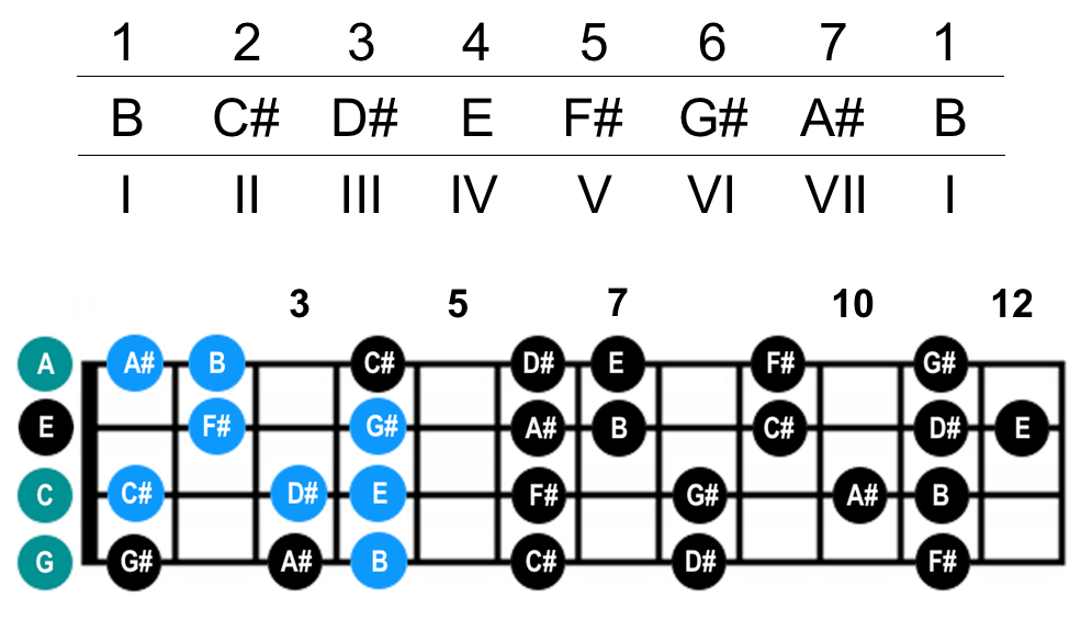 | Bmaj7 | 1-3-5-7 | B-D#-F#-A# |