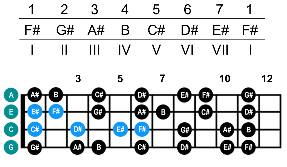 | F#7 | 1-3-5-b7 | F#-A#-C#-E |